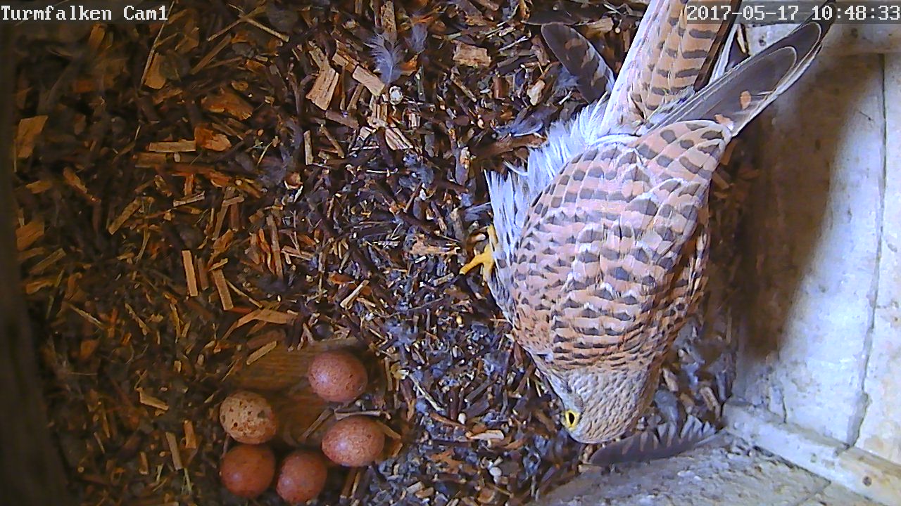Leider mussten wir heute zur Kenntnis nehmen das unsere Falkendame nur noch 5 Eier bebrütet. Entweder gibt es doch nicht genug Beute oder eins der Eier war „taub“. Es wird also definitiv maximal 5 Küken als Nachwuchs geben. Voraussichtlicher Schlupf wird am Wochenende 26.-28. Mai sein – pünktlich zum Deutschen evangelischen Kirchentag.