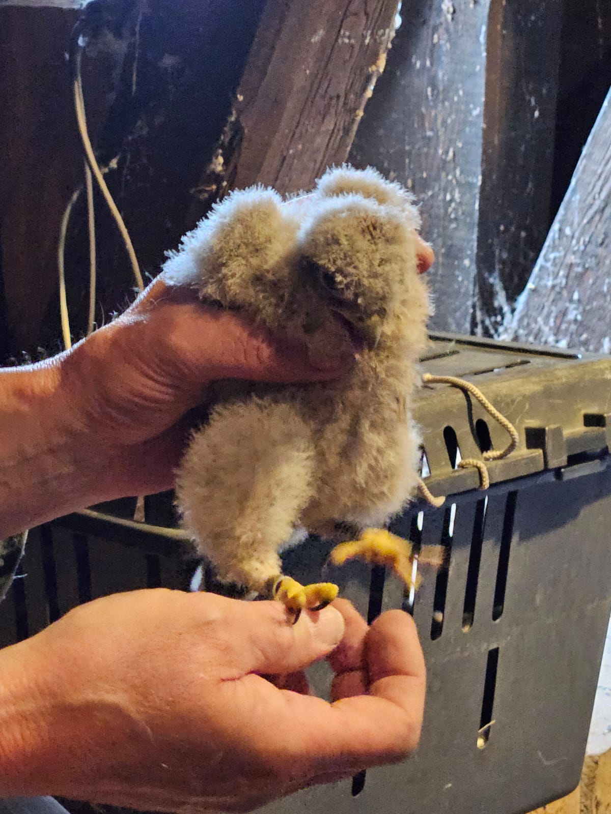 Hier wurde nun der Einflug des Kastens verschlossen nachdem Herr Kupko sich überzeugt hatte das sich kein Elterntier mehr im Kasten befindet. Danach öffnete er den Kasten und unsere 6 Küken kamen in eine eigens dafür mitgebrachte Transportbox. Im Anschluss wurden alle Jungen gewogen, vermessen und beringt und kamen dann nach ein paar Erklärungen wieder in die Box aus der sie dann zum Schluss wieder in den Kasten gesetzt wurden. Danach wurde der Kasten verschlossen und der Einflug wieder frei gegeben. Kurze Zeit später waren dann auch die Alttiere wieder da und brachten Futter.